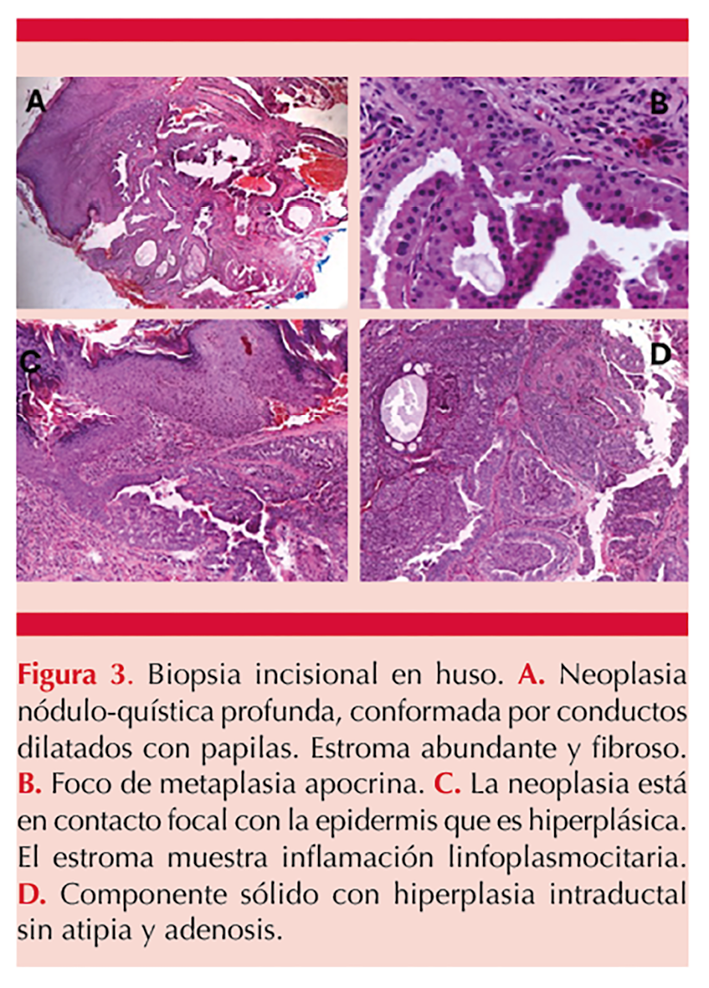 La biopsia incisional en huso se envió a estudio dermatopatológico que reportó epidermis con hiperplasia irregular de grado intenso, hiperortoqueratosis laminar e hipergranulosis. En todo el espesor del estroma se observó proliferación de conductos mayores dilatados con papilas exuberantes y algunas micropapilas. Había proliferación de pequeños agregados de células ductales (adenosis) y en otros focos había hiperplasia intraductal usual. Se reconocieron células mioepiteliales que recubrían esos conductos. Había comunicación con la epidermis suprayacente, donde se observaron perlas y quistes córneos. En la profundidad, los conductos mostraron metaplasia apocrina marcada. El estroma era edematoso, con infiltrado inflamatorio moderado, caracterizado por linfocitos, polimorfonucleares, células plasmáticas y agregados de macrófagos espumosos, sin datos de atipia. Figura 3