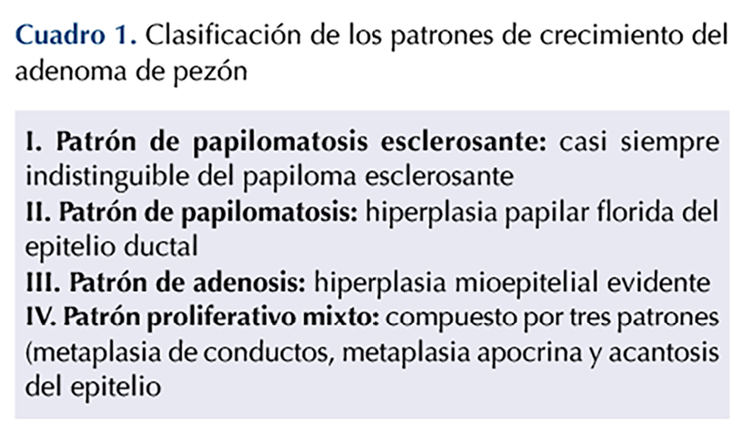 Entre los primeros autores que describieron el adenoma del pezón están Haagensen y su grupo, quienes, en 1951, lo describieron como un papiloma intraductal.3 En 1972 Paget le dio el nombre de adenoma del pezón. La Organización Mundial de la Salud (OMS) ha presentado dos definiciones en la clasificación de tumores de mama; en 2003 como una proliferación compacta de pequeños túbulos revestidos por células epiteliales y mioepiteliales, con o sin proliferación del componente epitelial, alrededor de los conductos colectores del pezón, y en 2012 como una proliferación epitelial benigna localizada dentro y alrededor de los conductos colectores.4 En 2014 la Sociedad Japonesa del Cáncer de Mama definió el adenoma del pezón como un tumor que sobreviene papilar o sólidamente en el conducto galactóforo del pezón o justo debajo de la areola.5