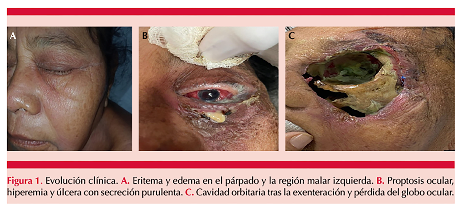 Se comunica el caso de una paciente de 66 años con antecedentes de diabetes tipo 2, quien ingresó por cetoacidosis diabética grave y celulitis orbitaria izquierda (Figura 1A). A la exploración física se observó una dermatosis localizada en la cabeza que afectaba el párpado y la región malar del lado izquierdo, constituida por eritema y edema que evolucionaron rápidamente a manchas eritematovioláceas y áreas necróticas, con dolor, aumento de temperatura local, ptosis palpebral y cefalea intensa. Se diagnosticó inicialmente como celulitis orbitaria y se administró cefalosporina de tercera generación; sin embargo, no se observó mejoría, y el estado neurológico se deterioró rápidamente, con salida de material purulento ocular, rinorrea purulenta y úlcera palatina de 8 x 6 cm no purulenta. Figura 1B