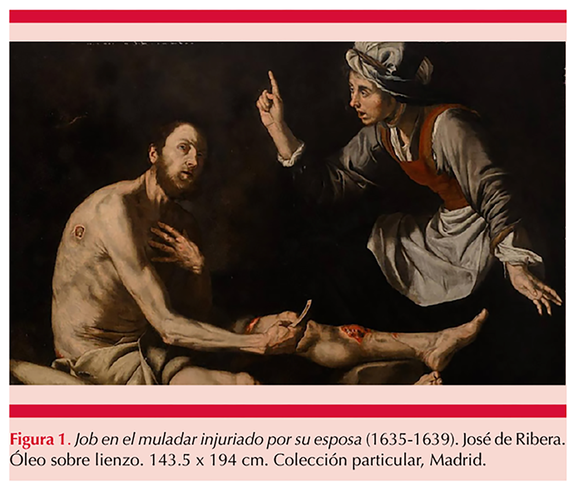 Al examinar la pintura, vemos a Job sentado en el muladar, su cuerpo consumido por la enfermedad, con la piel lacerada y los músculos tensos, lo que refleja una mezcla de sufrimiento y resignación. Junto a él, su esposa, vestida con ropas austeras y oscuras, se inclina hacia él con un gesto de recriminación y en su rostro un reflejo de ira y desesperanza, en alusión a la frase bíblica: “¿Aún tienes tu integridad? Maldice a Dios y muérete” (Job 2:9). El uso magistral del claroscuro intensifica las emociones de los personajes, creando una atmósfera cargada de tensión y dramatismo que impacta al espectador.