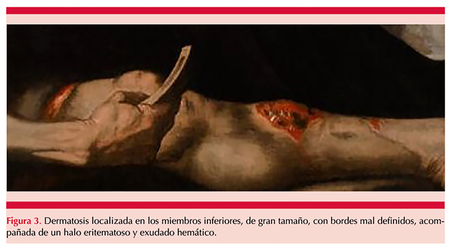 Las lesiones cutáneas visibles en la imagen se localizan en la región del hombro y los miembros inferiores, con características compatibles con úlceras de gran tamaño. La lesión en el hombro (Figura 2) tiene una forma circular, bien delimitada, con bordes bien definidos y un centro necrótico, mientras que las úlceras en los miembros inferiores (Figura 3) muestran bordes irregulares, rodeadas por un halo eritematoso y un exudado hemático. Ambas lesiones sugieren diversos diagnósticos: un proceso infeccioso, úlceras secundarias a insuficiencia vascular o, incluso, manifestaciones cutáneas de enfermedades autoinmunitarias.