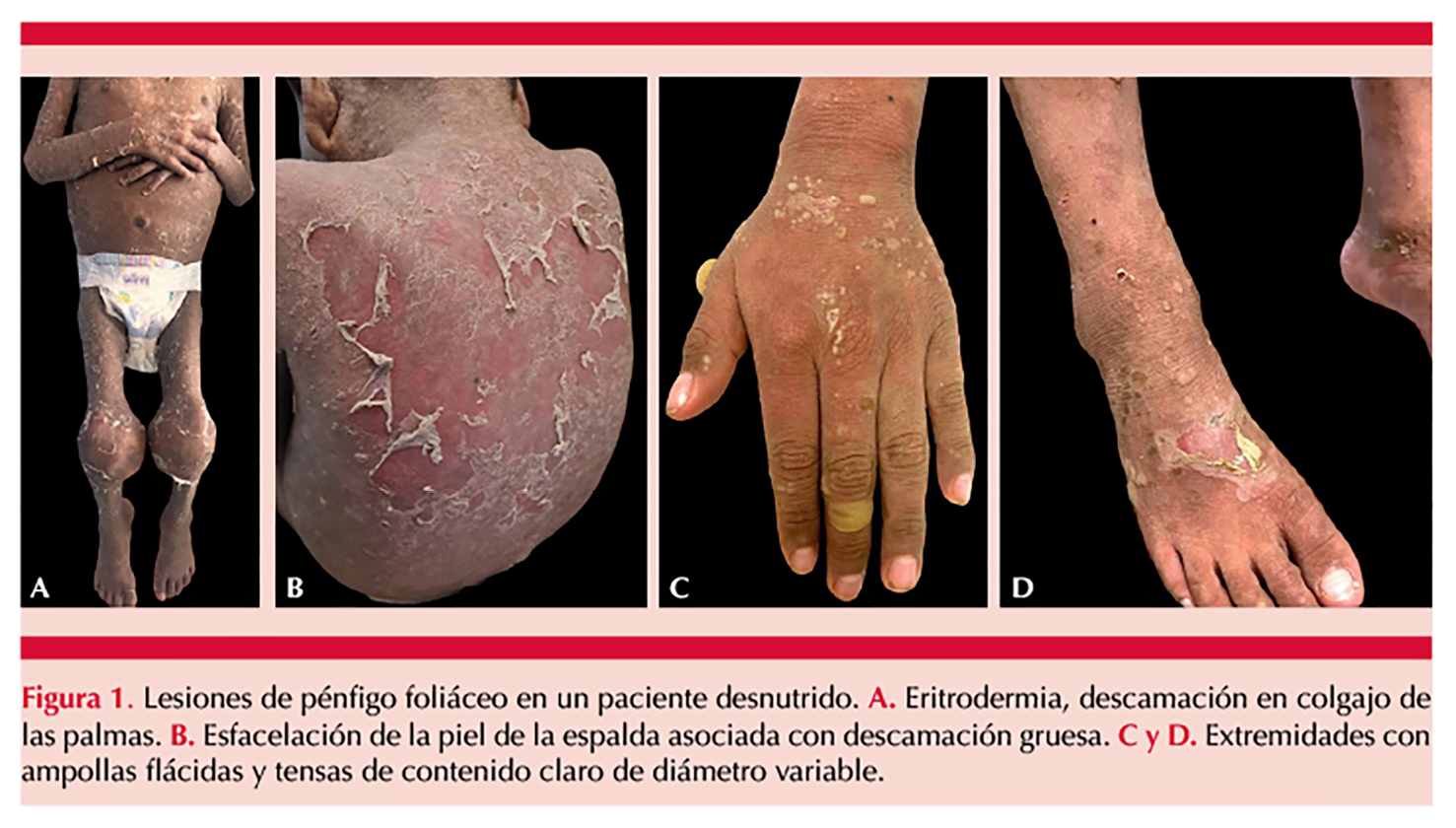 Se comunicó el caso de un paciente de ocho años con manifestación inicial atípica debido a su asociación con desnutrición proteico-energética grave. Este caso clínico resalta cómo la asociación entre pénfigo foliáceo y desnutrición representa un reto diagnóstico y terapéutico en nuestra práctica.