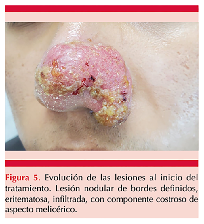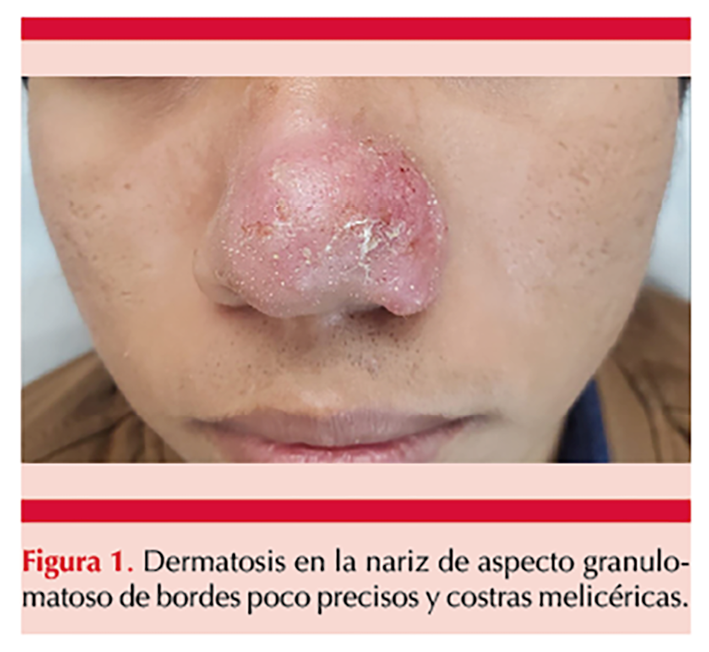 A la valoración en esta unidad hospitalaria se observó una dermatosis en la nariz, de aspecto granulomatoso, de bordes poco precisos y costras melicéricas. Figura 1