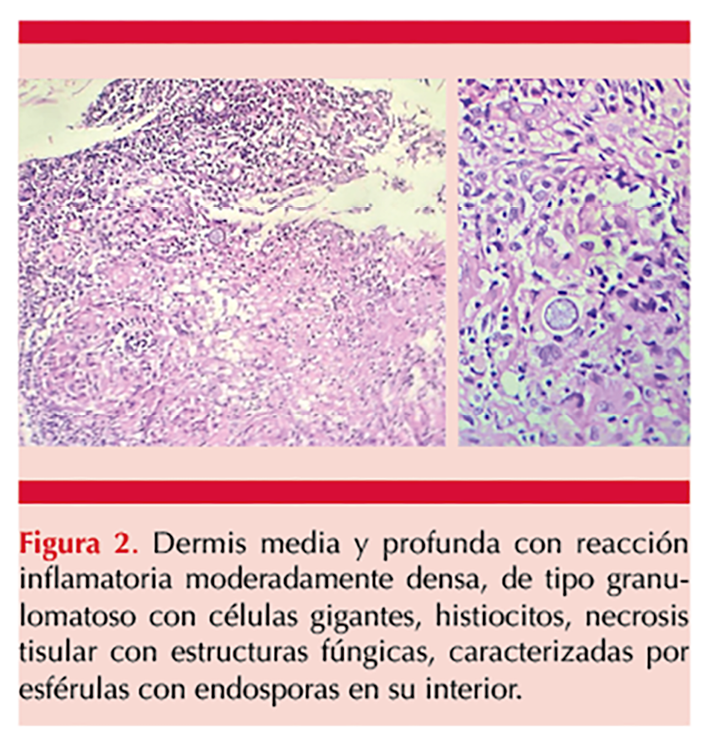 Se tomó biopsia cuyo estudio evidenció hallazgos histopatológicos compatibles con reacción inflamatoria de tipo granulomatoso con células gigantes, histiocitos, necrosis tisular con estructuras fúngicas caracterizadas por esférulas con endosporas en su interior. Figura 2