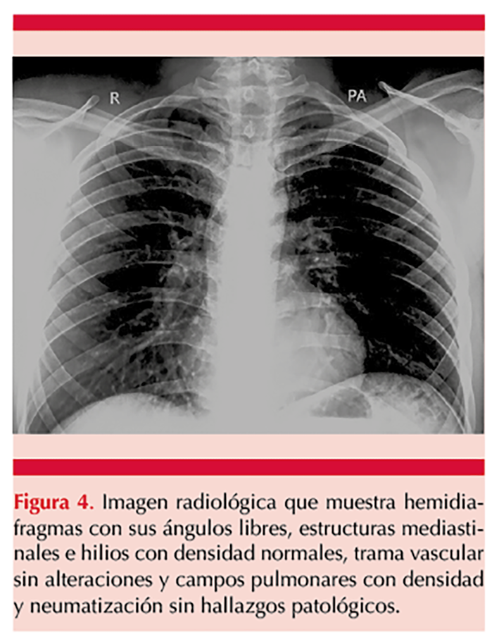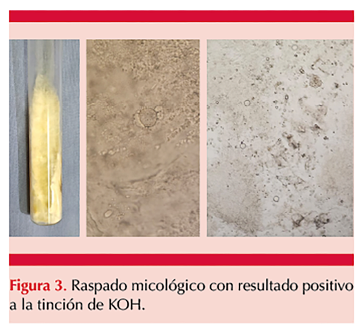 La tinción de PAS fue positiva, el raspado micológico tuvo resultado de KOH positivo (Figura 3) y en las pruebas serológicas para coccidioidomicosis se obtuvieron IgG e IgM reactivos. El cultivo detectó y tipificó Coccidioides immitis. La radiografía de tórax no evidenció hallazgos patológicos. Figura 4