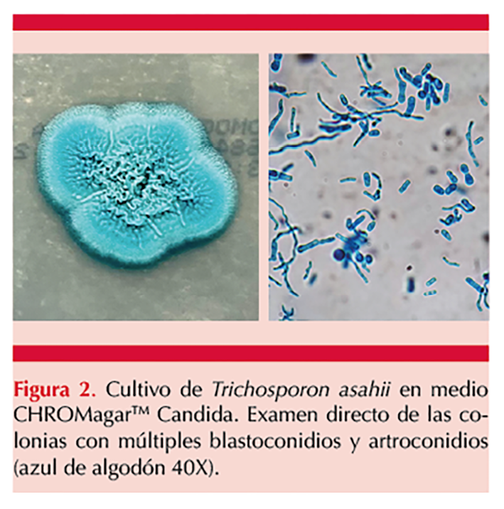 Al desarrollo del cultivo se identificaron colonias blancas de aspecto rugoso de color azul turquesa (en CHROMagarTM Candida). A la microscopia se observaron hifas acompañadas de blastoconidios y artroconidios (Figura 2), por lo que se identificó como Trichosporon sp.