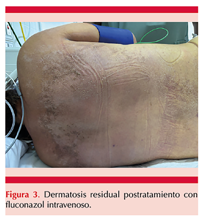 Se comunica el caso de una paciente sin antecedente de padecimientos crónico-degenerativos, de 44 años, originaria y residente de Tuxtla Gutiérrez, Chiapas, de ocupación hogar, hospitalizada por fuga de anastomosis secundaria a restitución de tránsito intestinal colorrectal-anastomosis término-terminal. Tuvo múltiples intervenciones quirúrgicas por una evolución tórpida y progresó a abdomen hostil BJORK 3B y peritonitis generalizada secundaria a perforación intestinal. En su día 32 de estancia hospitalaria manifestó una dermatosis localizada que afectaba el tronco posterior y los glúteos, constituida por placas eritematosas, de diferentes tamaños, algunas confluían formando lesiones de mayor tamaño, con escama fina blanquecina, bien adherida y áreas de maceración, acompañada de prurito intenso. Figura 1